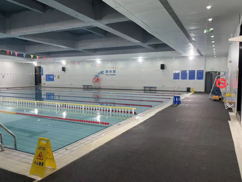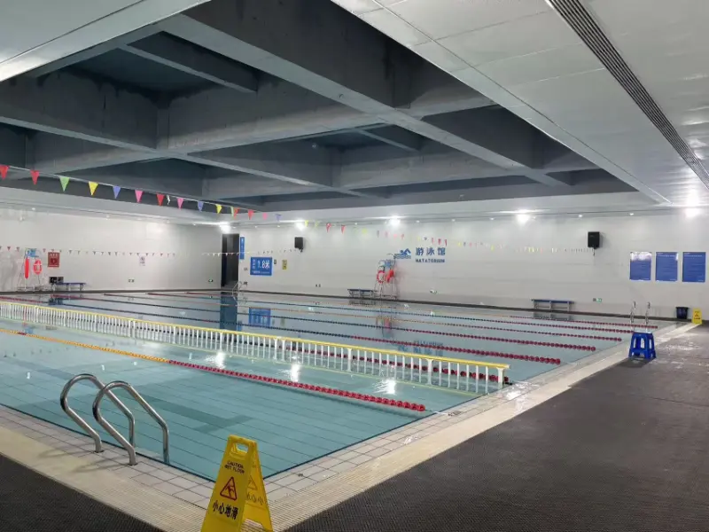 நீச்சல் குளத்தின் வெளிப்புறம் ஒரு உலோக மீன் அளவிலான பேனல் அமைப்பைக் கொண்டுள்ளது, இது ஒரு அளவு போன்ற ஒளி மற்றும் நிழல் விளைவை உருவாக்குகிறது, இது முகப்பின் வளைவு மற்றும் சூரிய ஒளியின் திசையுடன் மாறும், "நீர் ஓட்டத்தை" மேம்படுத்துகிறது. உட்புற பூல் பகுதியின் முழு கூரை அமைப்பும் வெளிப்படும், 48 மீட்டர் நீளமுள்ள ஒரு டிரஸ், கட்டமைப்பு தர்க்கத்தின் வெளிப்படையான வெளிப்பாட்டை வலியுறுத்துகிறது மற்றும் விளையாட்டு அரங்கின் இடஞ்சார்ந்த அளவு மற்றும் சக்தி உணர்வை வலுப்படுத்துகிறது. மைதானத்தில் இரண்டு குளங்கள் உள்ளன: ஒரு போட்டிக் குளம் மற்றும் ஒரு பயிற்சிக் குளம். போட்டிக் குளம் 50 மீட்டர் நீளம் மற்றும் 25 மீட்டர் அகலம், 8 பாதைகள்; பயிற்சிக் குளம் 50 மீட்டர் நீளமும், 17 மீட்டர் அகலமும், 6 பாதைகள் கொண்டது. இரண்டு குளங்களும் 2 மீட்டர் ஆழம் கொண்டவை.